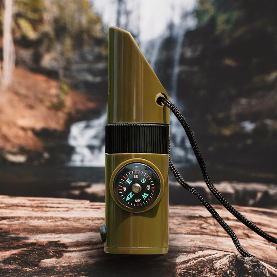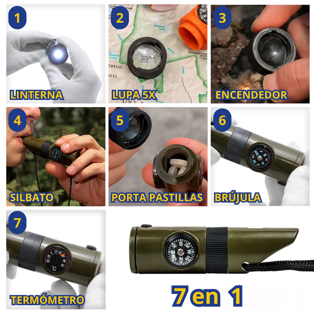 - 📯Silbato de Emergencia 7 en 1: linterna LED, lupa, encendedor solar, silbato, porta pastillas, brújula y termómetro.